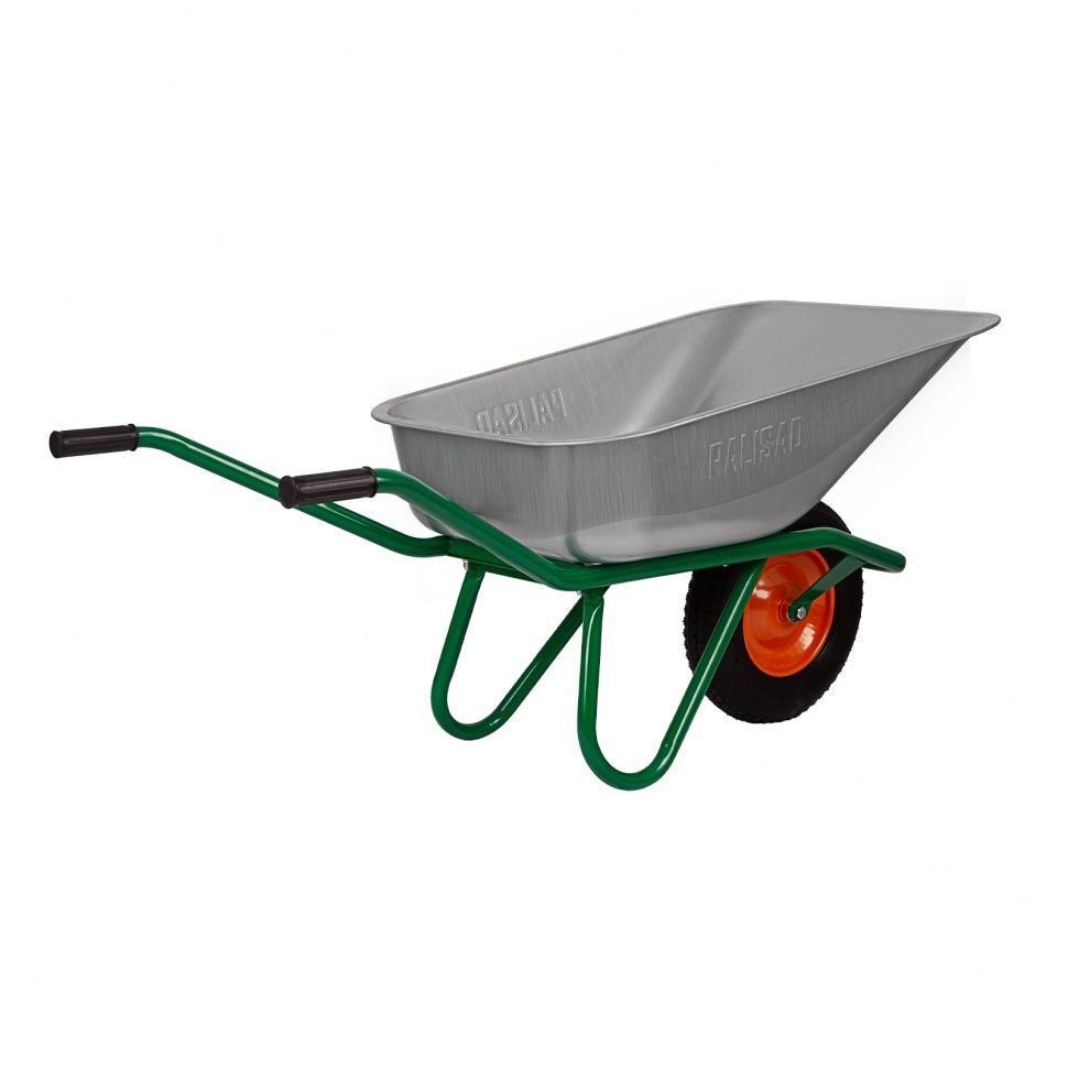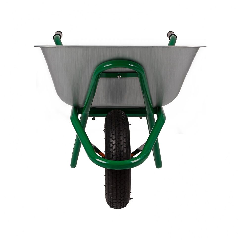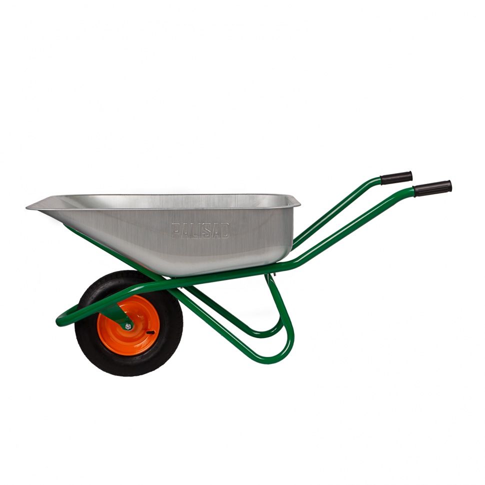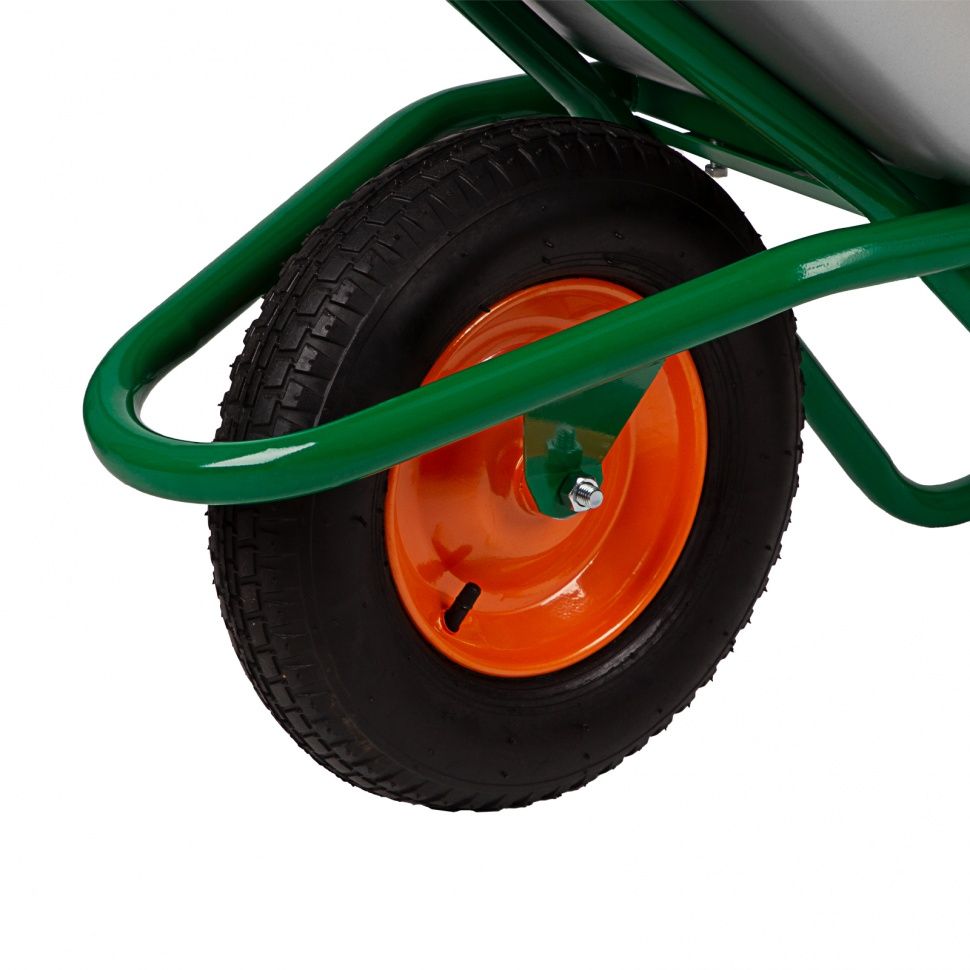 - пневматическое колесо с камерой и резиновой шиной гасит вибрации и обеспечивает плавность хода, что повышает комфортность использования тачки