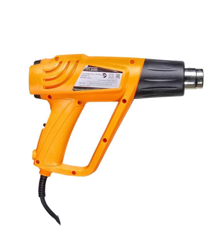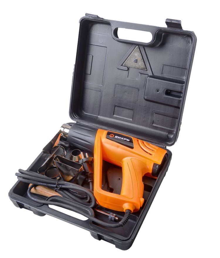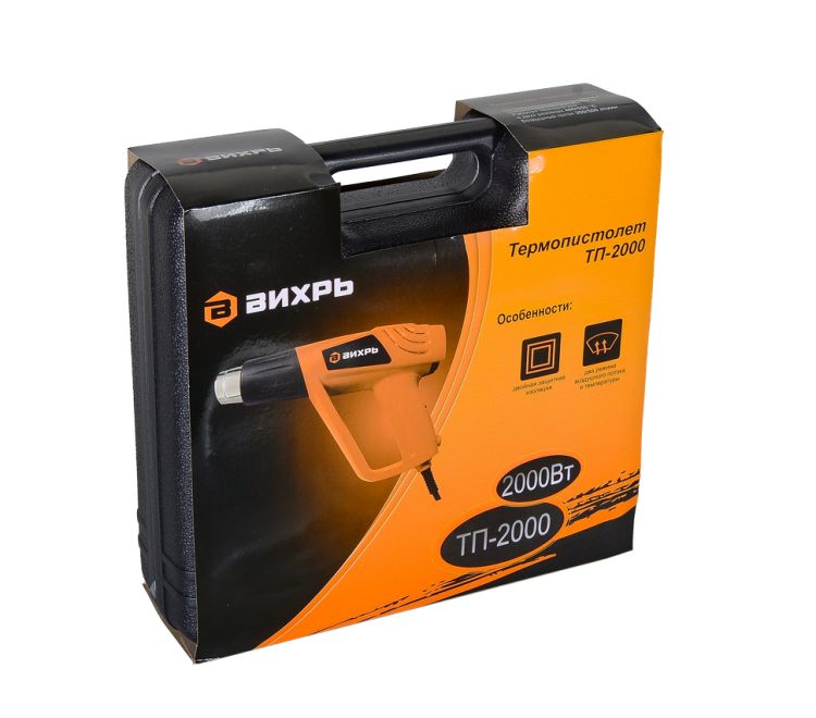 Термопистолет (фен промышленный) ВИХРЬ ТП-2000 – ручной электроинструмент для обработки горячим воздухом поверхностей и материалов, для удаления красок, формования и сварки пластмассы, нагревания термоусадочных труб; инструмент также подходит для пайки и лужения, размягчения клеевых соединений (швов), а также размораживания водопроводных труб.
