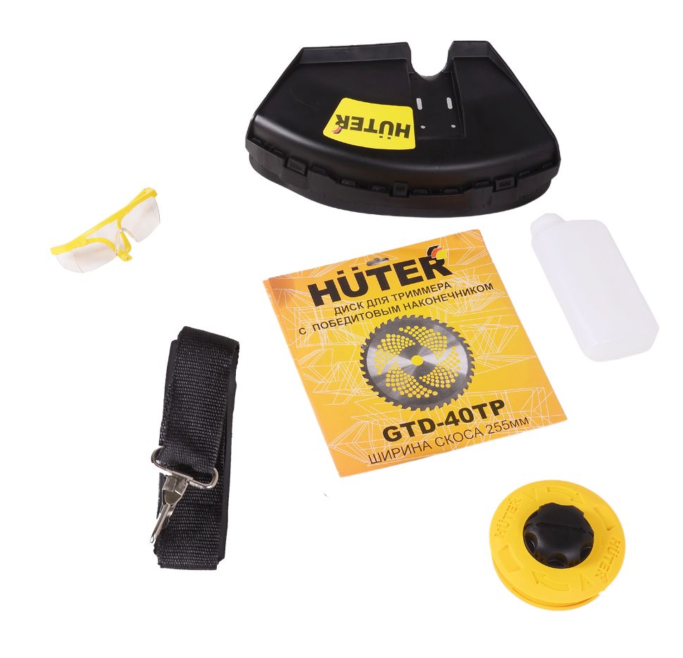 Паспорт изделия, Двигатель в сборе, Штанга в сборе с редуктором, Защитный кожух, Режущий диск, Катушка с леской, Рукоятки управления (левая и правая), Комплект ключей, Ранцевый ремень, Защитные очки